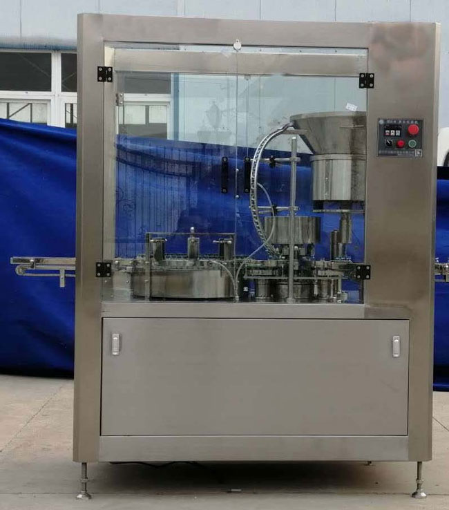 設備由架體、轉盤、進出瓶拔輪、鋁蓋下蓋系統、下瓶托、上壓頭、圓刀和電器控制系統等幾個部分組成。