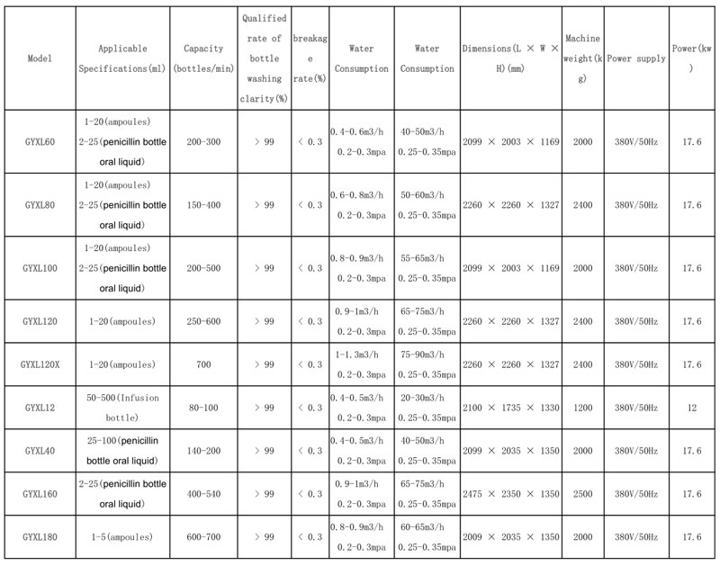 The vertical ultrasonic bottle washing machine adopts AC motor drive, frequency conversion speed regulation and PLC control circuit, and has reliable performance. The water temperature of the water tank is automatically controlled by constant temperature, and a water level control switch is installed to prevent the equipment from starting the water pump, ultrasonic wave and heating element in an anhydrous state. The water and gas pipeline is equipped with a pressure display, and the pressure can be adjusted through a valve. When online, it can receive signals from the filling machine and sterilization oven, and automatically stop when the bottle is squeezed.